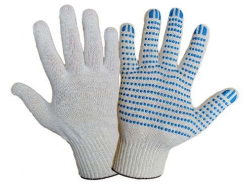 Универсальные рабочие перчатки, предназначены для защиты рук от мелких механических повреждений и общих производственных загрязнений. Рабочие перчатки изготовлены из хлопчатобумажной пряжи с покрытием точка из поливинилхлорида с нанесением рисунка на внутреннюю сторону перчатки. Покрытие ПВХ помогает обеспечить плотный захват и предотвращают соскальзывание детали. Перчатки трикотажные безразмерные с манжетой на резинке обеспечивают плотное прилегание перчатки к руке. Оптимальны для складских, садовых и ремонтных работ.