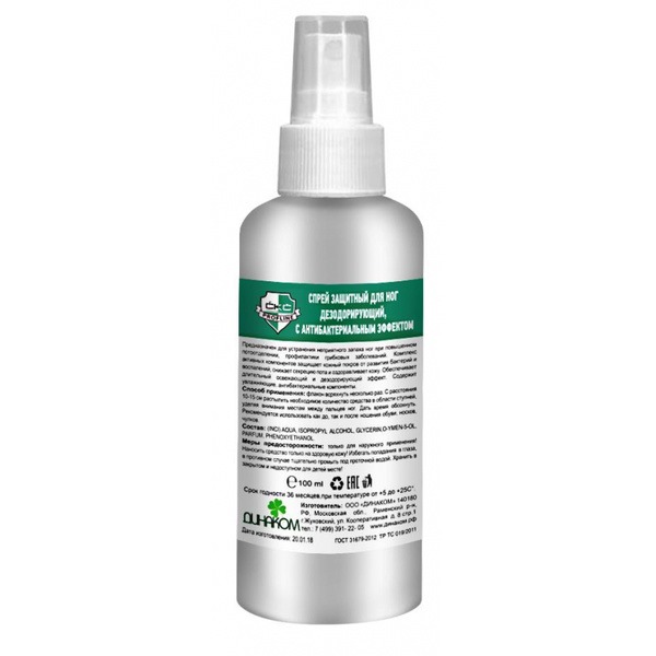 Спрей для ног ДЕЗОДОРИРУЮЩИЙ с антибактериальным эффектом предназначен для устранения неприятного запаха ног при повышенном потоотделении, профилактики грибковых заболеваний. Комплекс активных компонентов защищает кожный покров, снижает секрецию пота и оздоравливает кожу. Обеспечивает длительный освежающий и дезодорирующий эффект. Содержит увлажняющие, антибактериальные