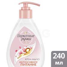 Крем-мыло жидкое Бархатные ручки Интенсивное питание. Мягко очищает кожу рук, не сушит ее. Действие подтверждено исследованиями производителя. Кремовая текстура превращает мытье рук в уход за руками. Содержит 20% восстанавливающей сыворотки.